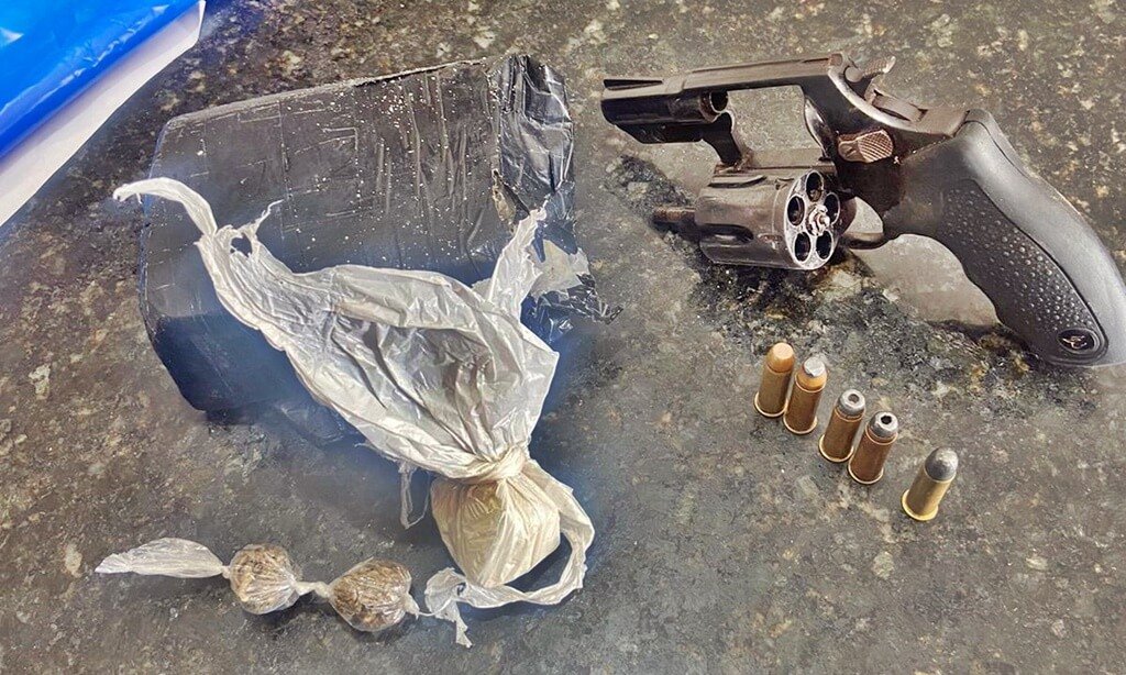 Na abordagem, os policiais encontraram com o indivíduo, de 20 anos, um revólver calibre 38 (municiado), além de uma sacola plástica contendo cerca de 450 gramas de maconha e 22 de cocaína.