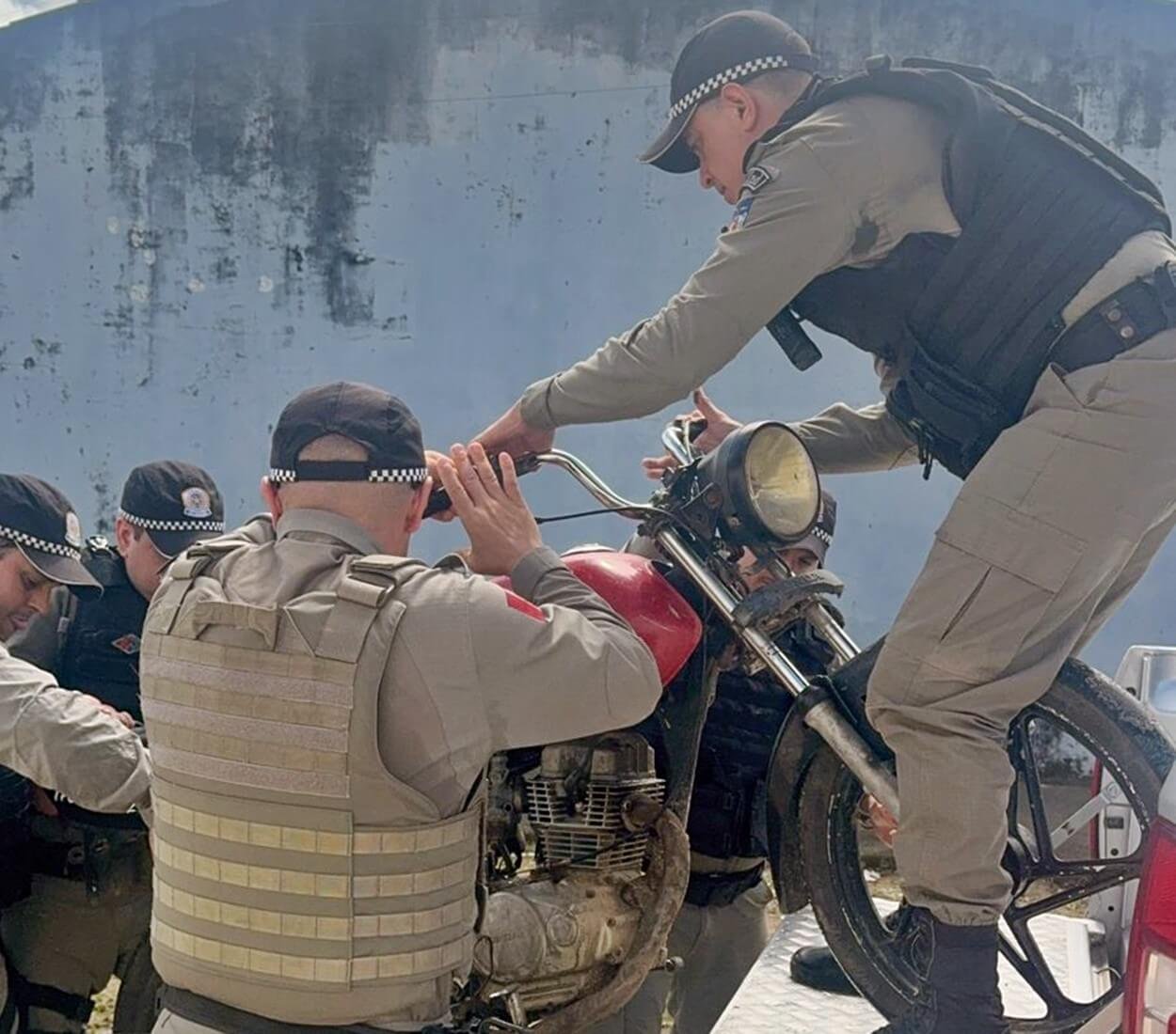 A ocorrência foi registrada quando as guarnições de Rádio Patrulha (RP 02), ADM 01 e ADM 02, visualizaram uma motocicleta transitando sem placa de identificação.