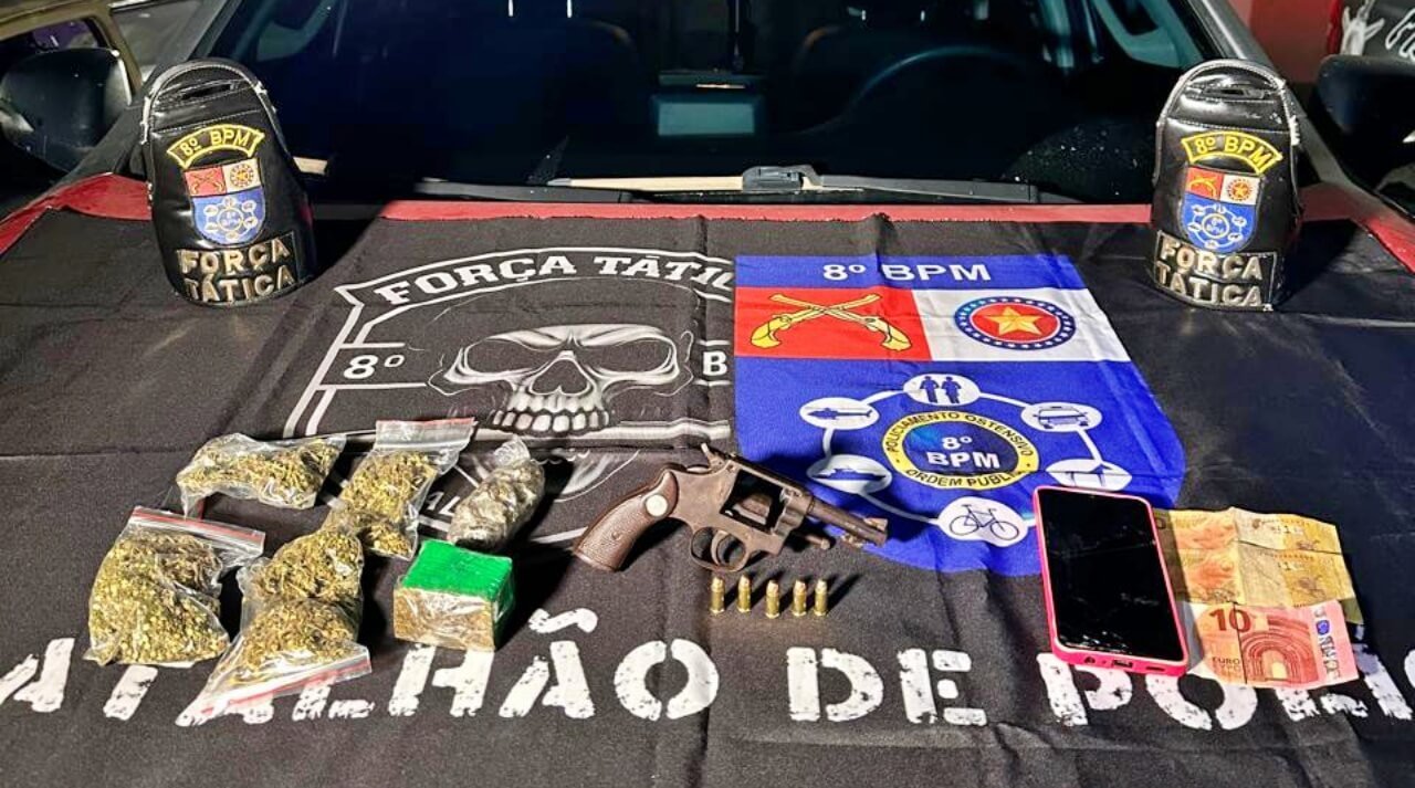 Durante buscas no perímetro, os militares encontraram uma sacola contendo aproximadamente 150 gramas de cocaína, um revólver calibre 32 municiado e cinco munições do mesmo calibre. O material foi encaminhado à Central de Flagrantes. Até o momento, nenhum envolvido na ocorrência foi identificado.
