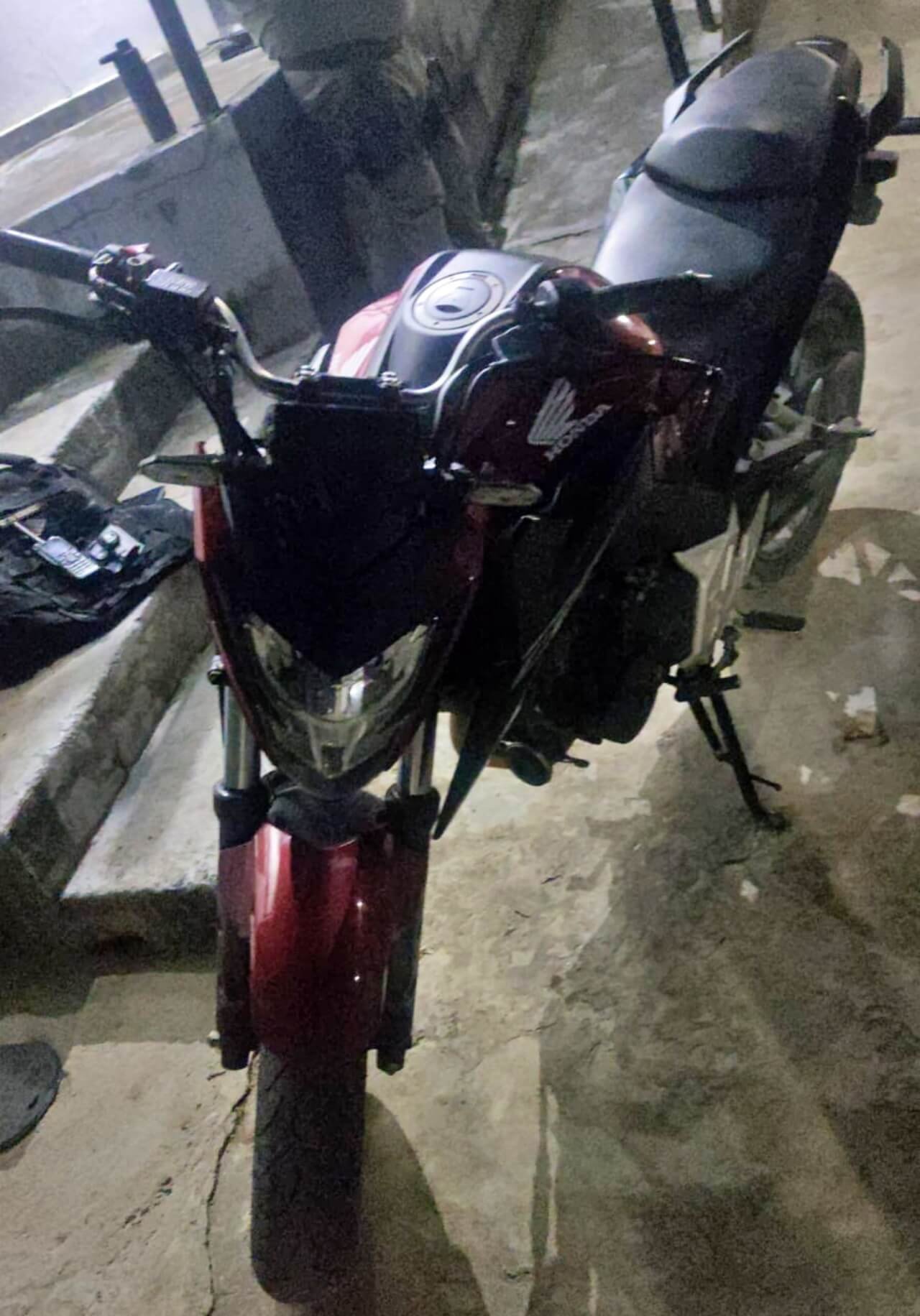 Após a verificação dos sinais identificadores e consulta do número do chassi, foi constatado que se tratava de uma Honda CB300F Twister CBS, ano 2025, com registro de roubo. O veículo possui placa TNK1F02/AL e estava escondido em meio à vegetação.