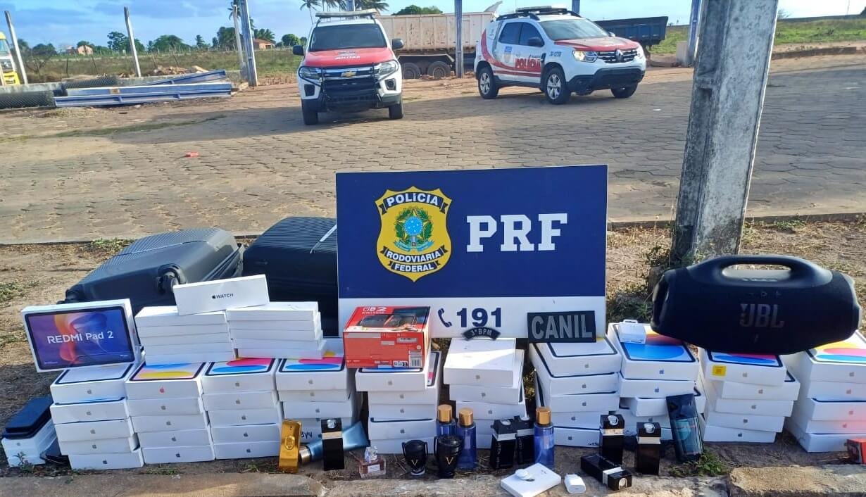 Dentro do carro foram encontrados diversos itens de descaminho. Os materiais apreendidos foram: 2 IPHONE 14 PRO MAX; 4 IPHONE 16 PRO MAX; 3 IPHONE 17; 11 APPLE WACTHES; 50 IPADs A16; 1 REDMI PAD2; 1 NINTENDO SWITCH; 6 PERFUMES SILVER SCENT; 1 PERFUME FUSION D'SSEY; 3 PERFUMES MIDNIGHT BLOOM VICTORIA SECRET; 1 PERFUME INVICTUS DE 50ML; 1 PERFUME INVICTUS DE 100ML; 1 PERFUME MISS DIOR; 1 PERFUME AQUA KISS VICTORIA SECRET; 1 CAIXA DE SOM BOOMBOX4; 1 CAIXA DE SOM JBL GO4 e 4 UNIDADES DE AIRTAG APPLE.