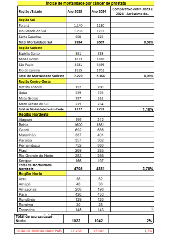 A maior incidência é esperada na região Sudeste (77,9 casos por 100 mil homens), seguida do Nordeste (73,3), Centro-Oeste (61,6), Sul (57,2) e Norte (28,4). No entanto, as taxas de mortalidade são maiores no Norte e Nordeste, demonstrando um diagnóstico mais tardio nessas regiões. Segundo dados do Instituto Nacional de Câncer (INCA), o Brasil registrou 17.258 óbitos por câncer de próstata em 2023 e 17.587 em 2024, representando um aumento de aproximadamente 2%. Alagoas concentra 212 dos 4.881 óbitos por câncer de próstata registrados na região Nordeste em 2024. A doença é a segunda principal causa de morte entre os homens, perdendo apenas para o câncer de pulmão. Confira, a seguir, a tabela por estado.