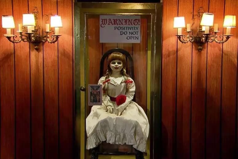 A boneca Annabelle estava sentada em uma vitrine de madeira e vidro, trancada. Ela trazia uma placa com os dizeres: "Aviso: Não abra em hipótese alguma.