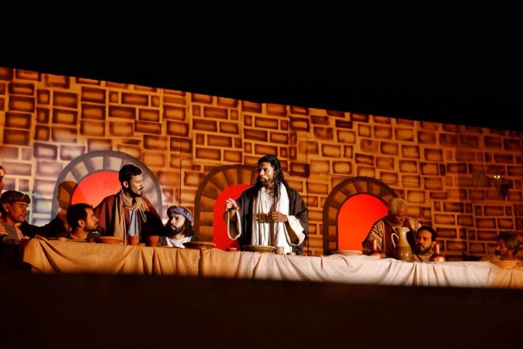 O espetáculo tem cerca de 1h e 50min, acontece a céu aberto, gratuitamente, numa estrutura que conta com 4 palcos, que se transformam em 9 cenários, e que remetem à época de Jerusalém. Serão empregados recursos tecnológicos, de som, luz, e efeitos, que farão o público sentir a emoção e fazer parte do espetáculo.