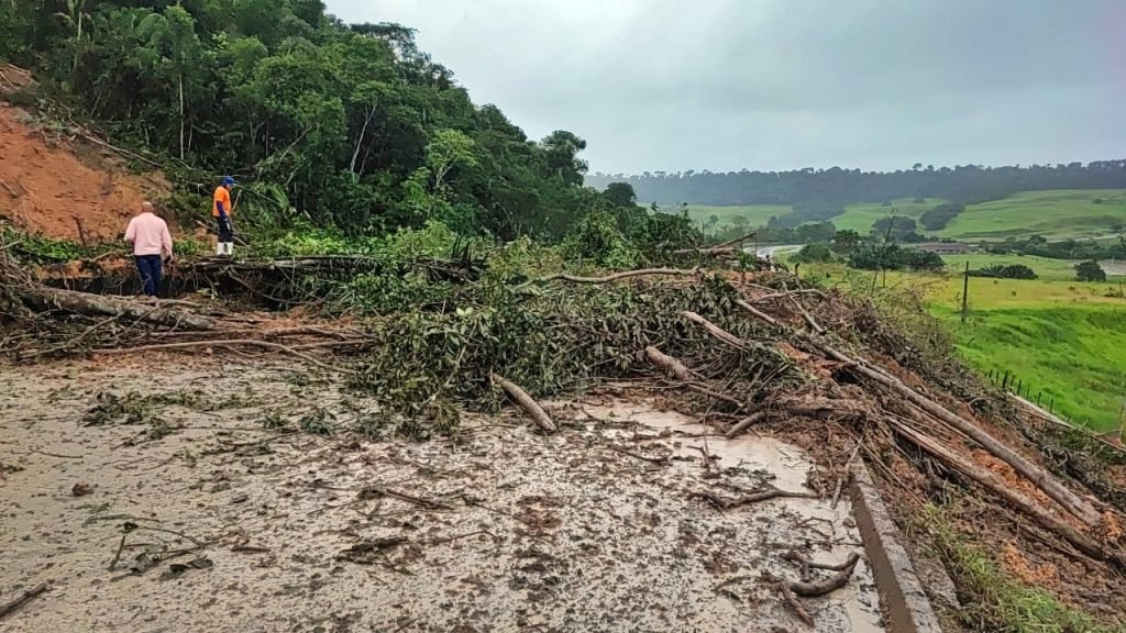 A Polícia Rodoviária Federal (PRF) informou, na manhã desta quinta-feira (26), que a BR 101, na altura do km 119, próximo a Fazenda Varela, esta interditada. O desabamento de uma barreira interrompeu o trafego de veículo dos dois sentidos da via.