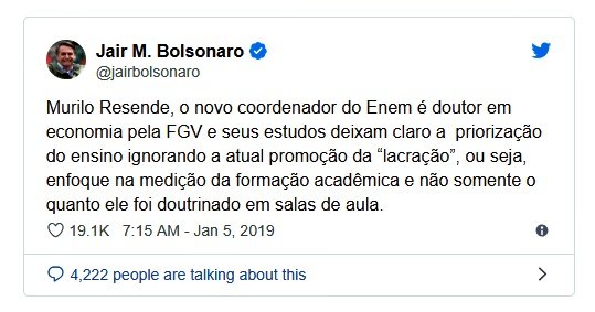 “Murilo Resende, o novo coordenador do Enem é doutor em economia pela FGV e seus estudos deixam claro a priorização do ensino ignorando a atual promoção da “lacração”, ou seja, enfoque na medição da formação acadêmica e não somente o quanto ele foi doutrinado em salas de aula”, escreveu Bolsonaro no microblog.