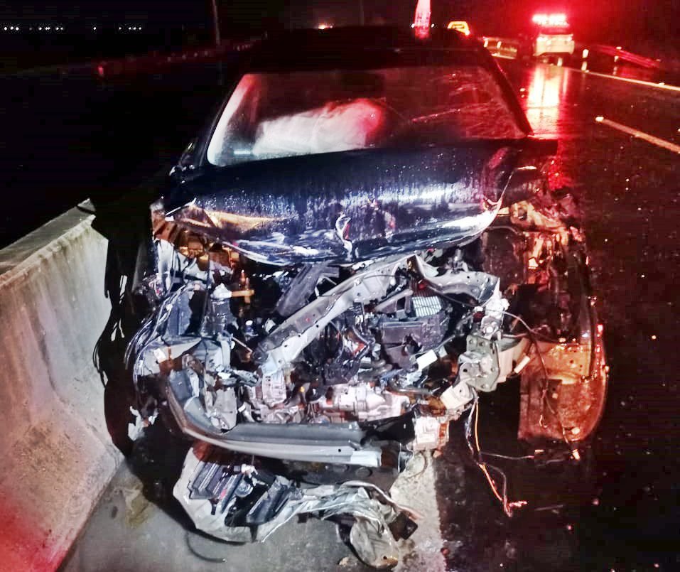 Ainda segundo o BPRv, o carro acabou colidindo frontalmente contra a mureta de contenção da via e posteriormente com a estrutura da divisão das vias no lado aposto. O impacto destruiu completamente a frente do Honda.