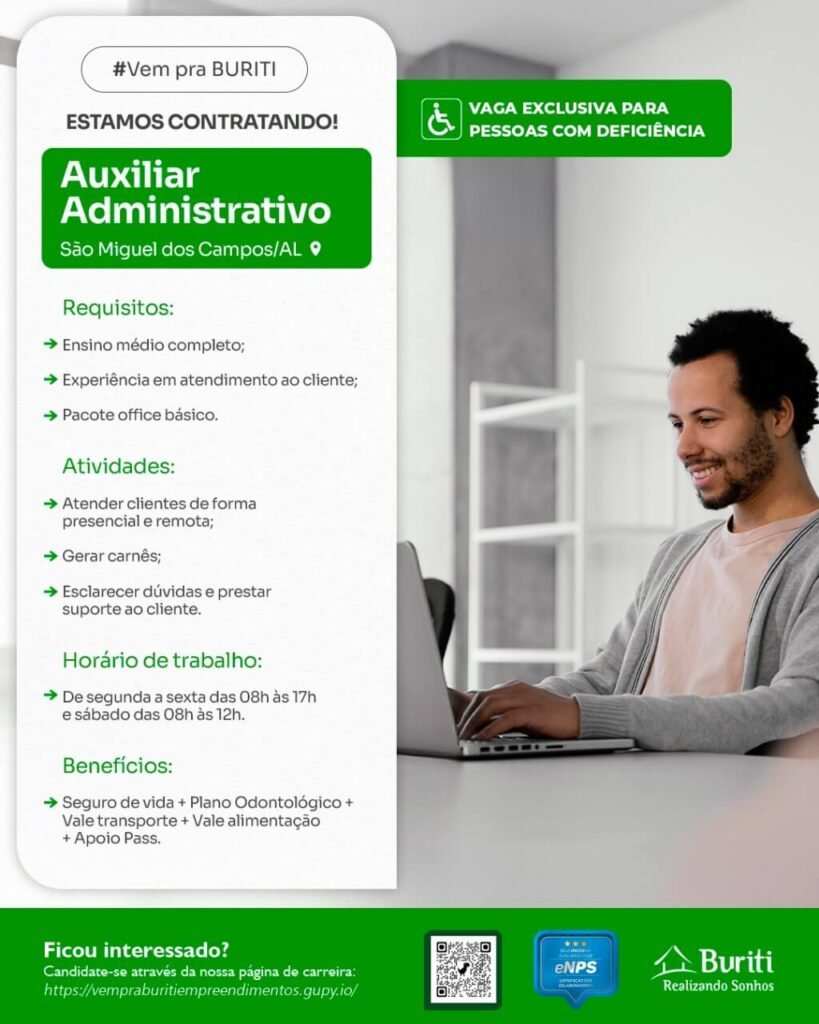 A Buriti Empreendimentos, uma das maiores empresas do ramo de planejamento e desenvolvimento urbano do Brasil, está com uma excelente oportunidade para pessoas com deficiência em São Miguel dos Campos. A empresa busca um Auxiliar Administrativo para integrar sua equipe.