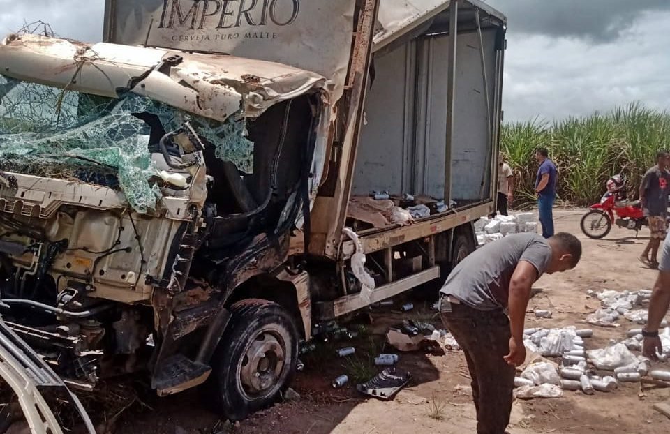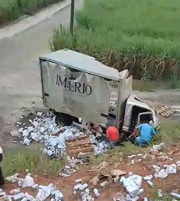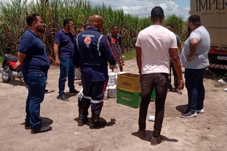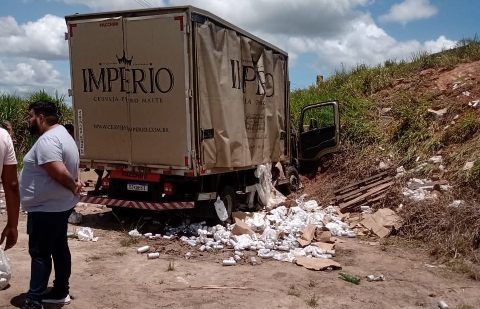 O veículo, do tipo baú, estava carregado com uma carga de cerveja, que ficou espalhada no acostamento da via.