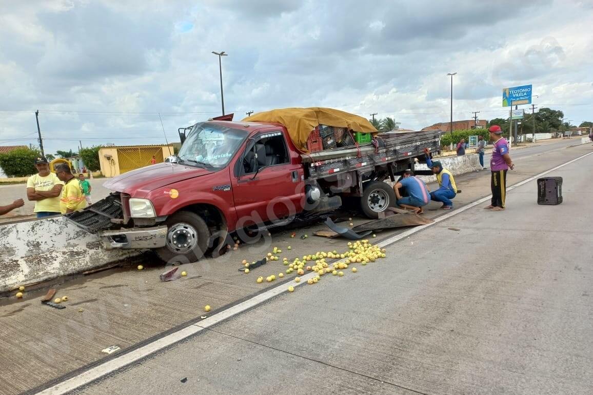 Com o choque, o veículo de carga teve toda a suspensão arrancada e ficou parcialmente destruído. O condutor e o ajude, ambos de identidade não revelada, foram socorridos e encaminhado ao hospital da cidade com escoriações leves.