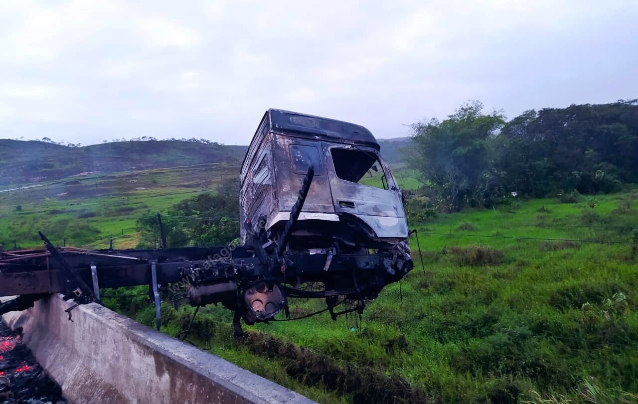 Ainda segundo informações, logo após o choque, o veículo pegou fogo, mas o condutor conseguiu sair da cabine e, para sobreviver, foi obrigado a pular da ponte e caiu numa região de lamaçal.