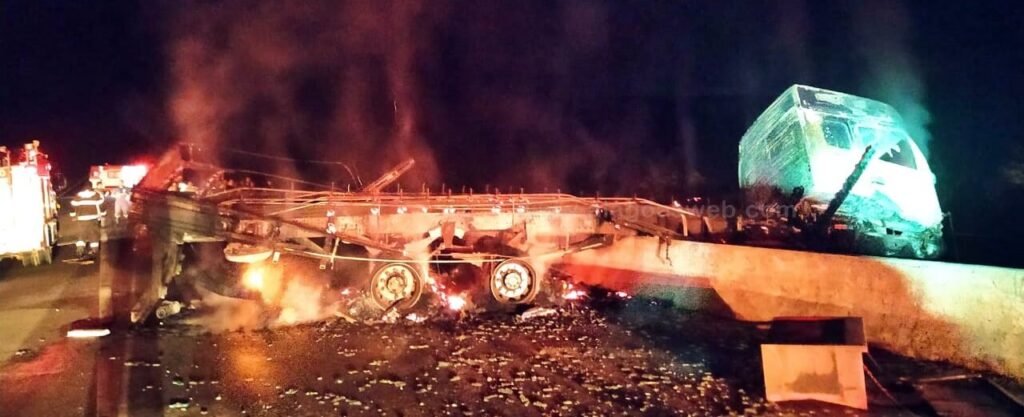 Caminhão pega fogo após acidente na BR-101 em Jequiá da Praia no interior de Alagoas