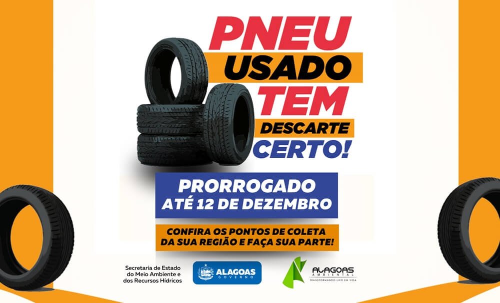 A Secretaria de Estado do Meio Ambiente e dos Recursos Hídricos de Alagoas (Semarh) prorrogou a campanha “Pneu usado tem descarte certo” até o dia 12 de dezembro. A ação, em parceria com a Alagoas Ambiental e as secretarias municipais, visa recolher pneus que não servem mais com o intuito de evitar a proliferação do mosquito Aedes aegypti. A campanha busca ainda falar sobre a importância da logística reversa junto a estabelecimentos que comercializam pneus.