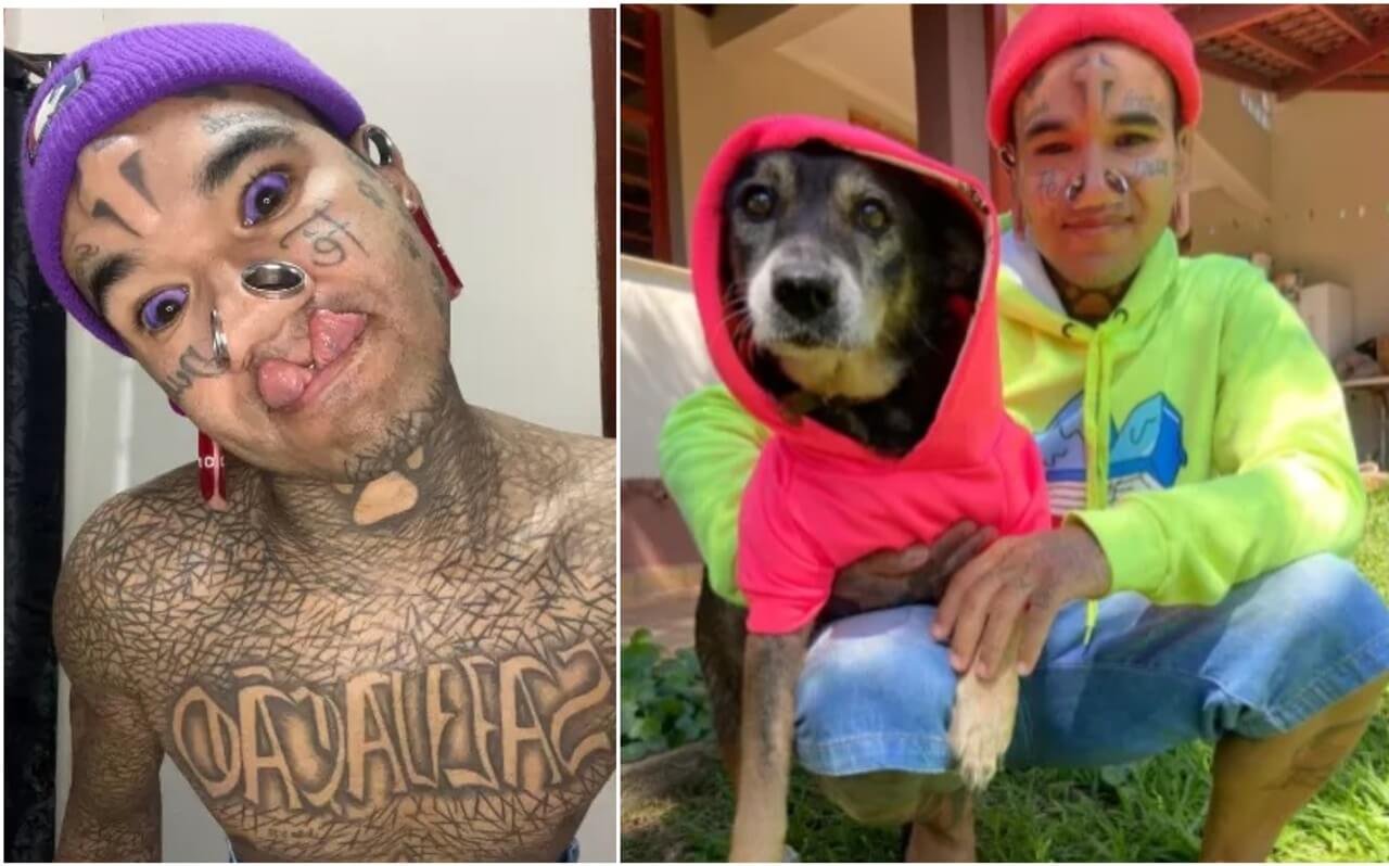 Adriano Lemos, 33, começou a modificar o corpo aos 16 anos. Atualmente, a testa tem uma cruz, os olhos estão roxos, a a língua partida ao meio, e o nariz tem alargadores. Fora que 70% do corpo está coberto com tatuagens. Apesar do estilo, Adriano é evangélico.