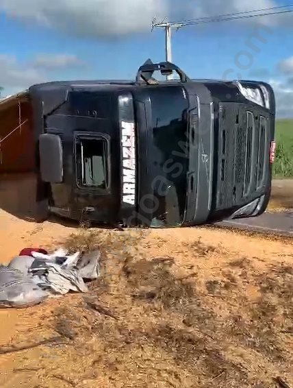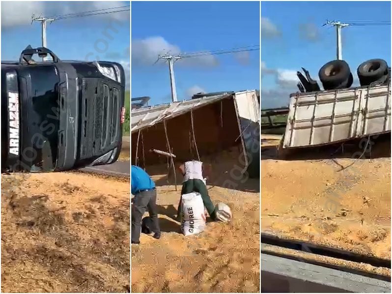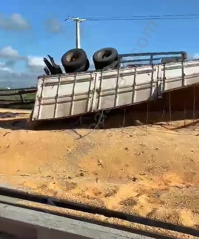 O veículo transportava uma carga de milho a granel e tombou no acostamento da pista, no trecho popularmente conhecido como ‘curva do junco’, onde frequentemente ocorrem acidentes por conta da curva acentuada.