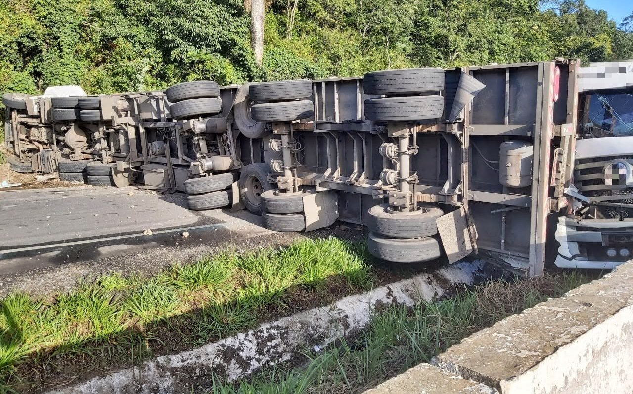 Após o motorista de uma carreta, que transportava alumínio para reciclagem, perder o controle da direção e tombar em uma curva, um segundo veículo (caminhão do tipo tanque), colidiu na carreta tombada.