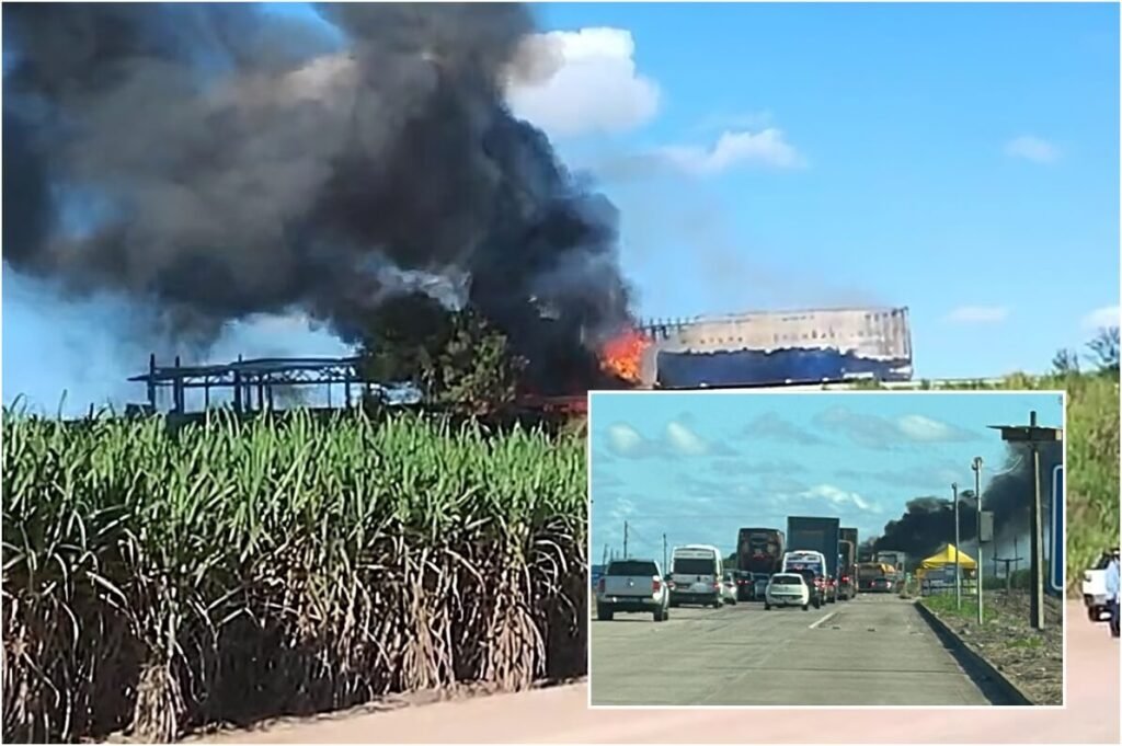 Carretas pegam fogo após colisão frontal na BR-101 em São Miguel dos Campos