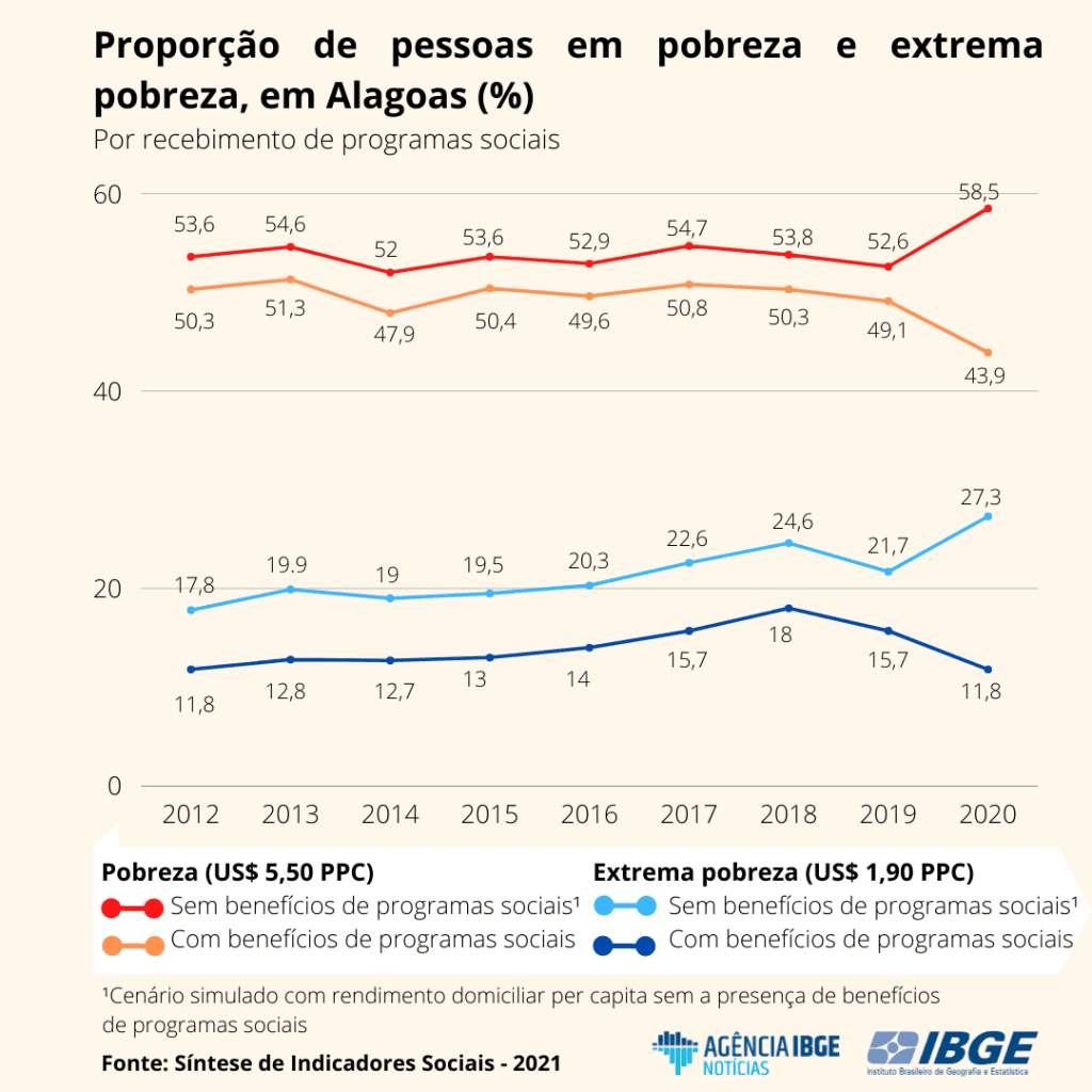 Em Alagoas, a incidência de extrema pobreza em 2020 ficou estável quando comparada a 2012, início da série, e caiu em relação a 2019, quando 15,7% da população vivia nessa condição. Já a proporção de pessoas em situação de pobreza em 2020 caiu em relação a 2012 e 2019.