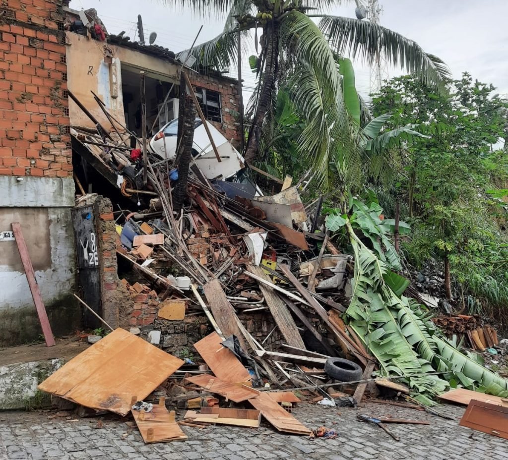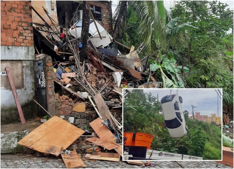 O desmoronamento de uma laje, supostamente provocado pelas chuvas, causou sérios problemas e levou junto um veículo modelo Fiat Palio, cor branca, no final da manhã desta segunda-feira, dia 22, no bairro do Jacintinho, em Maceió.