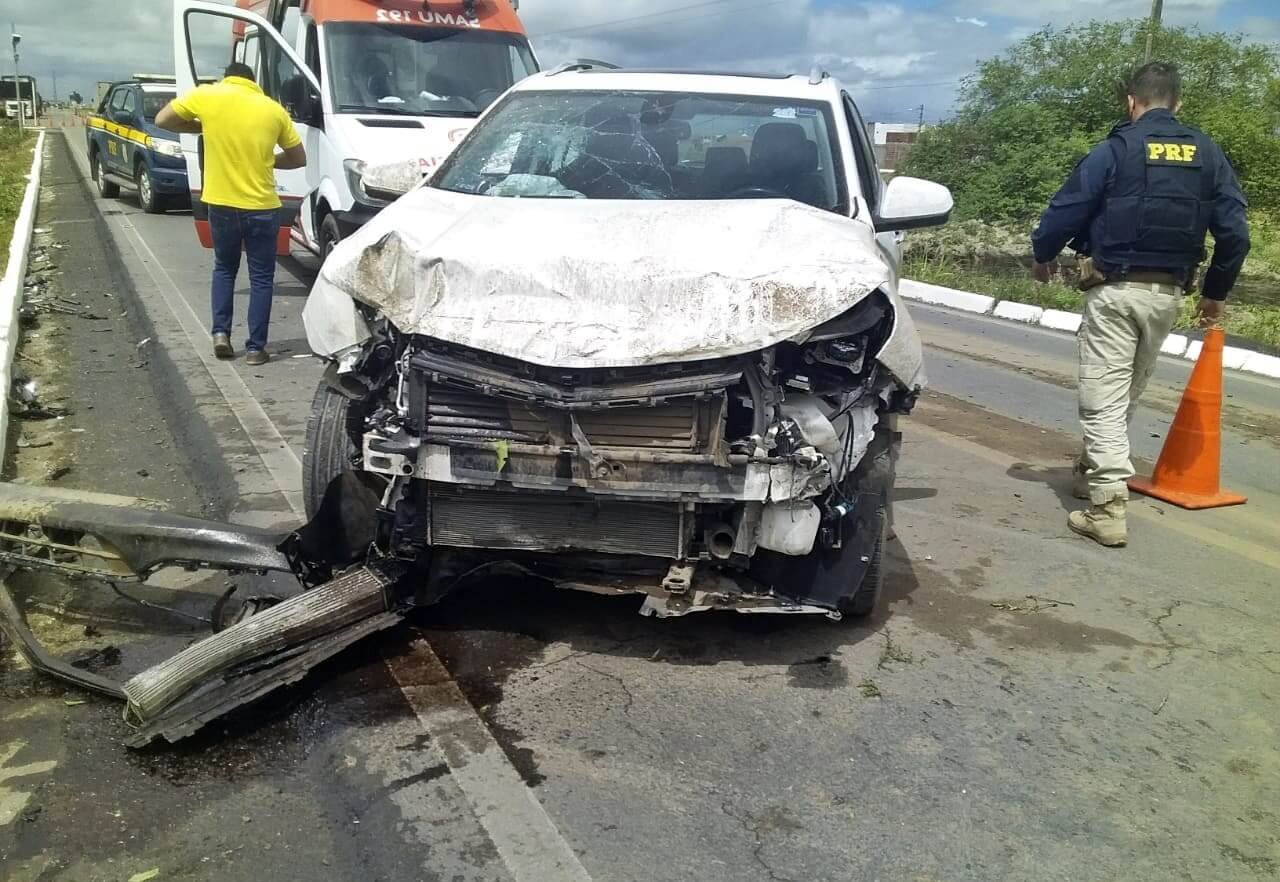 O utilitário bateu contra um caminhão do tipo baú. O impacto destruiu a frente do veículo. Ambos foram retirados da pista e recolhido para o posto da PRF.