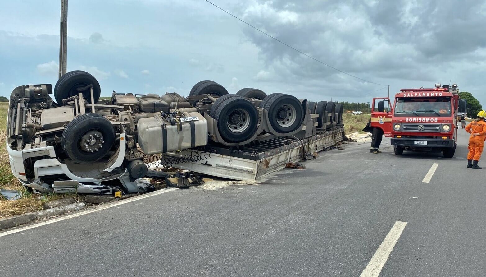 O condutor de uma carreta, ficou preso às ferragens do veículo, após um capotamento na manhã desta segunda-feira (29), na rodovia estadual AL 101 Sul, no trecho de acesso a Praia do Gunga, na Barra de São Miguel.