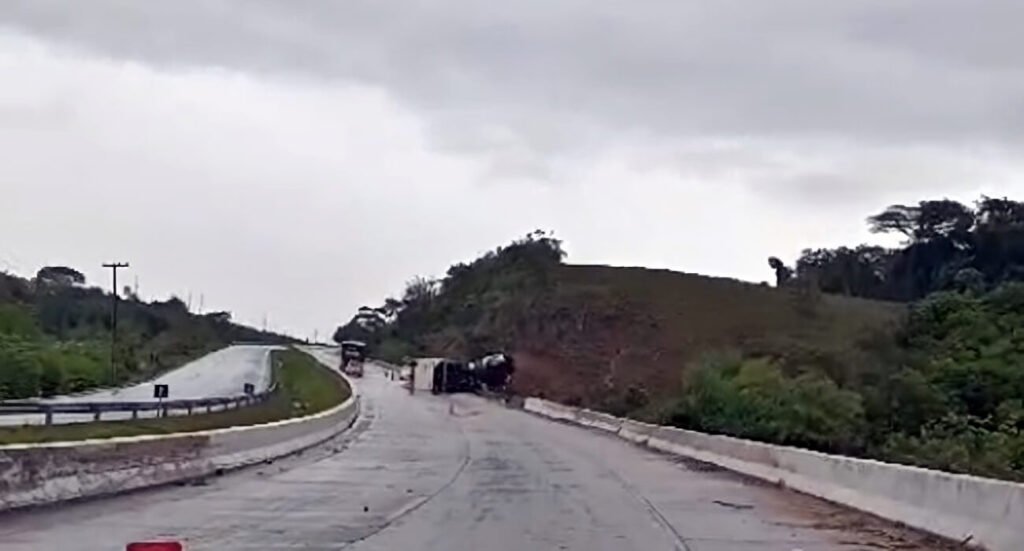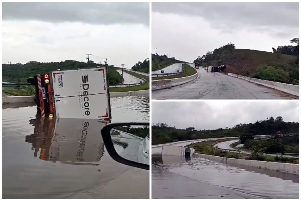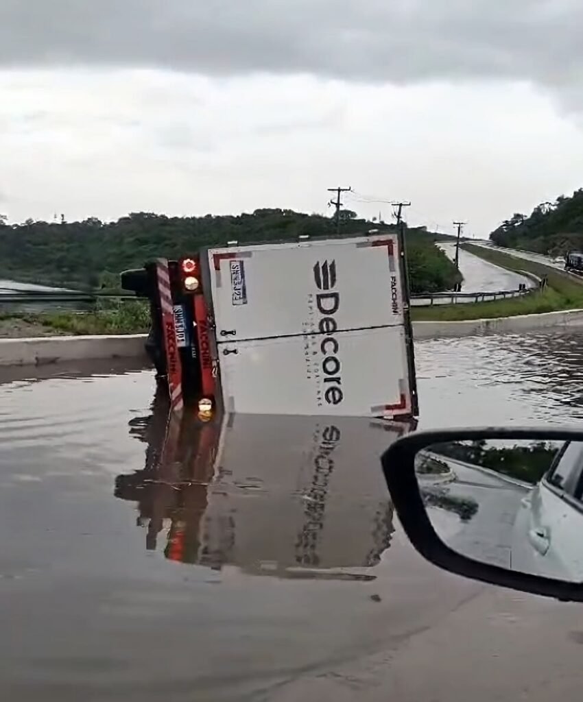 Nas primeiras horas desta quinta, dia 6, um segundo caminhão, do tipo baú, foi encontrado tombado na rodovia em um trecho alagado pelas águas das chuvas. O acúmulo de água na pista pode ter contribuído para a perda de controle do veículo.