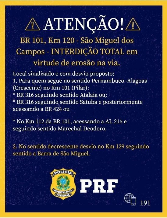 Em nota, a PRF havia informado que a interdição TOTAL acontece entre Pilar e São Miguel e informou os desvios propostos para que trafega entre Alagoas e Pernambuco.