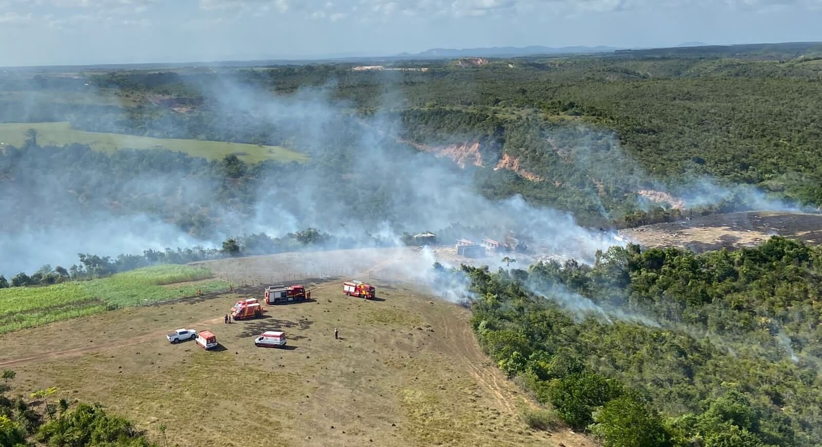 Um grande incêndio ocorreu logo após a explosão e atingiu grande parte do terreno. Um helicóptero, pertencente ao Samu e Corpo de Bombeiros, está sobrevoando a área para avaliar os danos.