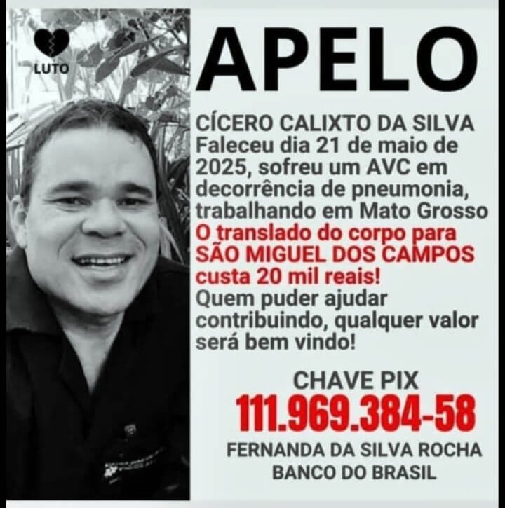 A família de Cícero Calixto da Silva está fazendo um apelo comovente à população para arrecadar fundos que viabilizem o translado de seu corpo do estado do Mato Grosso para São Miguel dos Campos, em Alagoas.