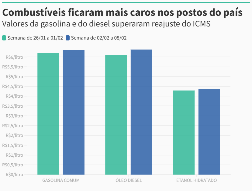 O preço médio da gasolina vendida nos postos do país, por exemplo, ficou em R$ 6,35 o litro, R$ 0,15 mais cara do que no período entre os dias 26 de janeiro e 1º de fevereiro, segundo dados da Agência Nacional do Petróleo, Gás Natural e Biocombustíveis do Brasil (ANP).
