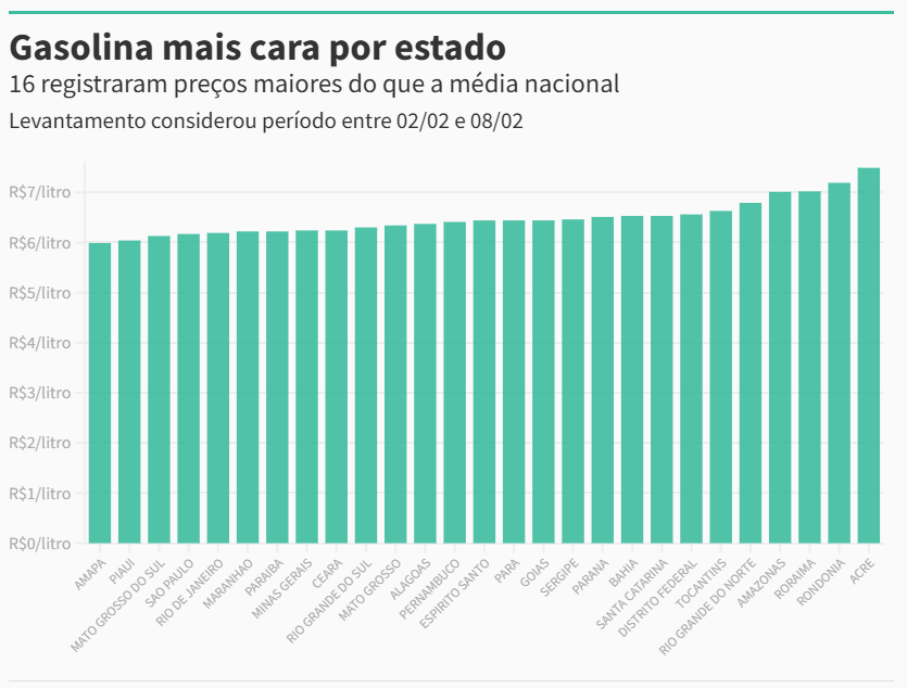 Olhando o preço da gasolina por Unidade Federativa, nove delas registraram altas ainda maiores do que a média nacional.