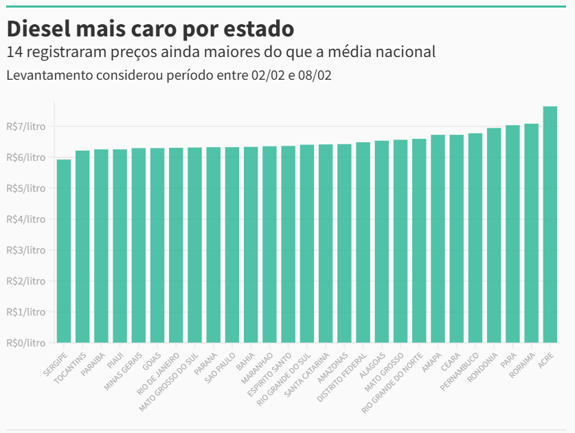 Já no caso do diesel, 10 UFs superaram a média nacional: Pernambuco, Distrito Federal, Maranhão, Espírito Santo, Rio Grande do Sul, Minas Gerais, Goiás, Santa Catarina, Paraná e Mato Grosso.