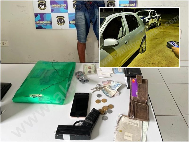 O veículo Chevrolet Celta, de cor prata, placa OHD-1782/AL, foi avistado pela guarnição que, suspeitou da movimentação do carro no local e realizou a aproximação para abordagem, mas o condutor empreendeu fuga.