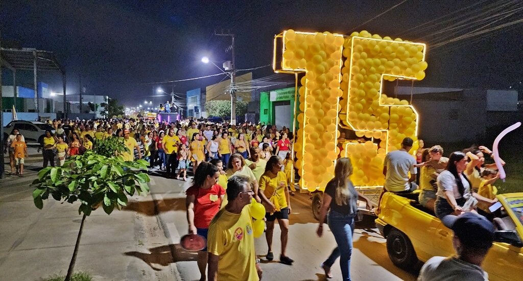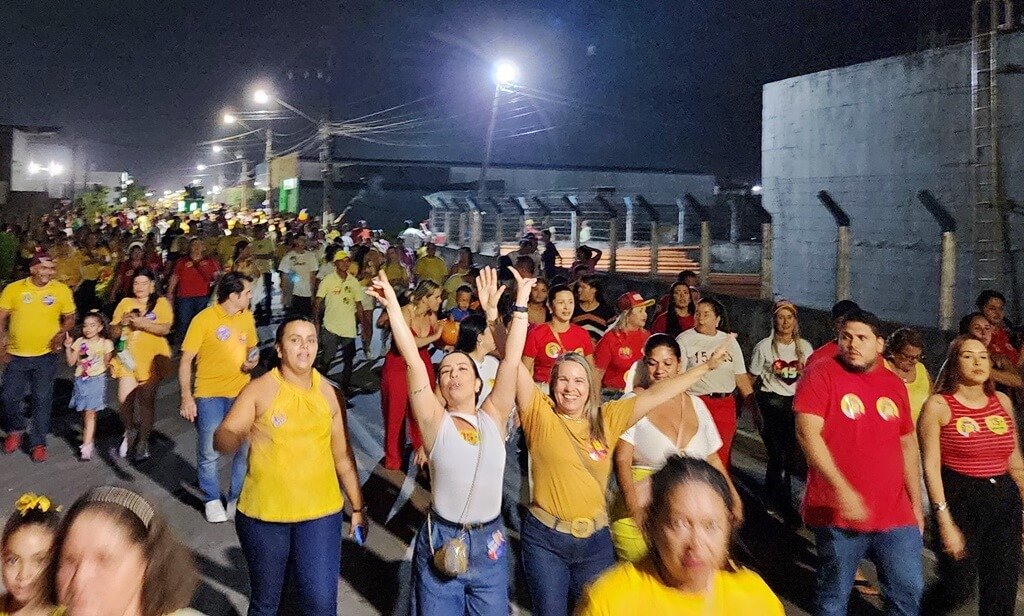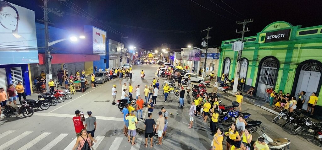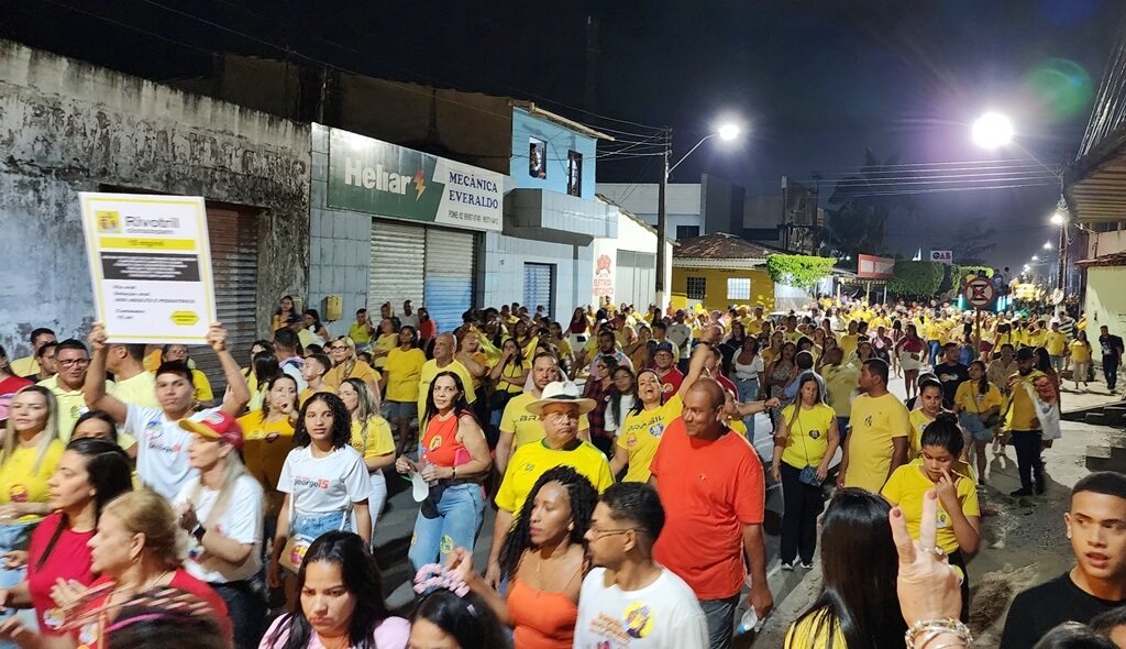 Milhares de pessoas vestidas de amarelo deixaram suas casas para acompanhar o candidato e seu vice, dr. Benildo, em um percurso pelas principais ruas da parte baixa da cidade, passando pelos bairros e culminando em um megacomício na Praça Miguel Cesar Teixeira (Praça do Relógio), no Centro.