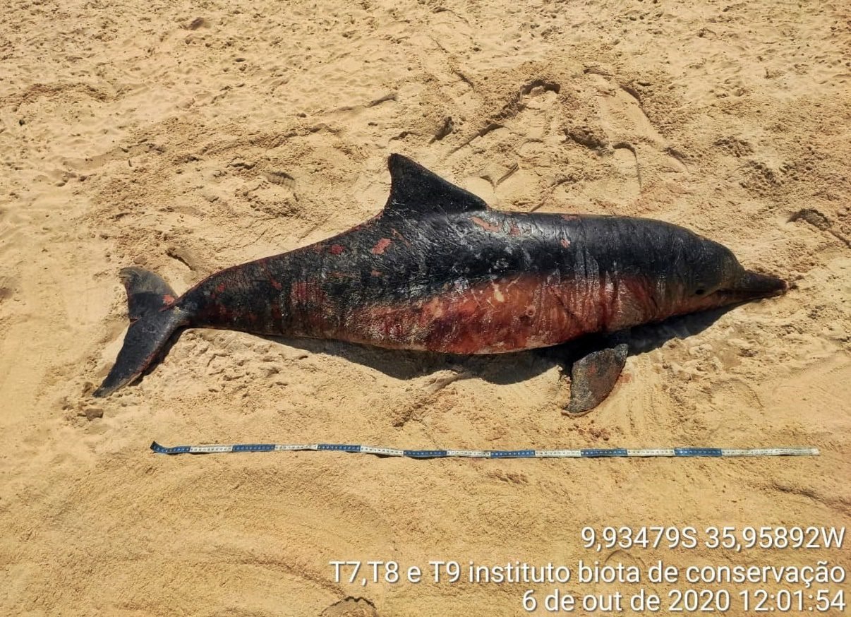 O animal, de aproximadamente 1,70cm, apresenta várias lesões, supostamente o boto encalhou na areia, antes de morrer. Ele foi encontrado por um monitor de praia do Instituto Biota de Conservação.