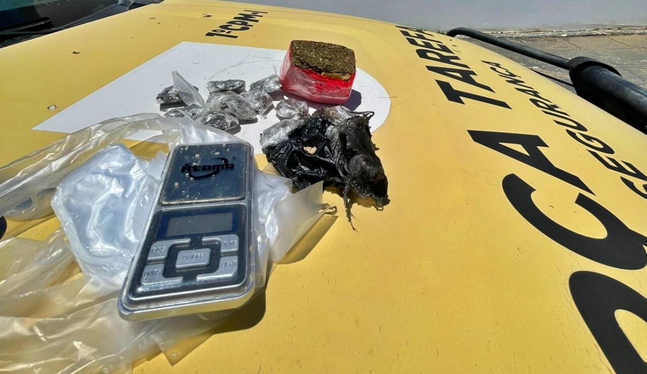 Na ação, a PM apreendeu uma poção de maconha pesando 161,6 gramas, 15 bombinhas de maconha totalizando 84,08 gramas, aproximadamente 1 grama de crack fracionado em pequenas porções, além de diversas embalagens plásticas e uma balança de precisão, material usado na comercialização da droga.