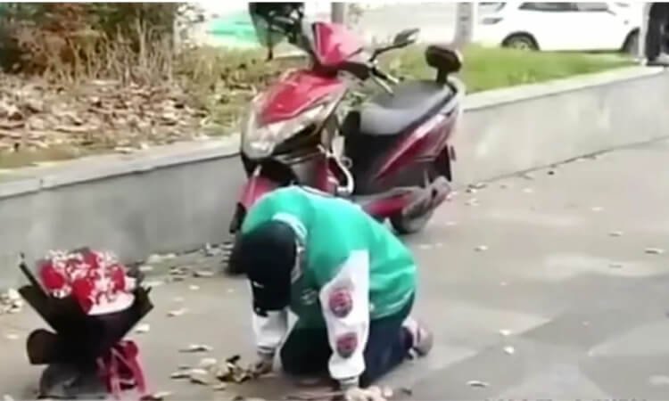 Com objetivo de voltar com a ex-namorada, um homem ficou ajoelhado segurando um buquê de flores, sob chuva, por 21 horas em frente ao local de trabalho da amada em Dazhou, na província de Sichuan, na China.