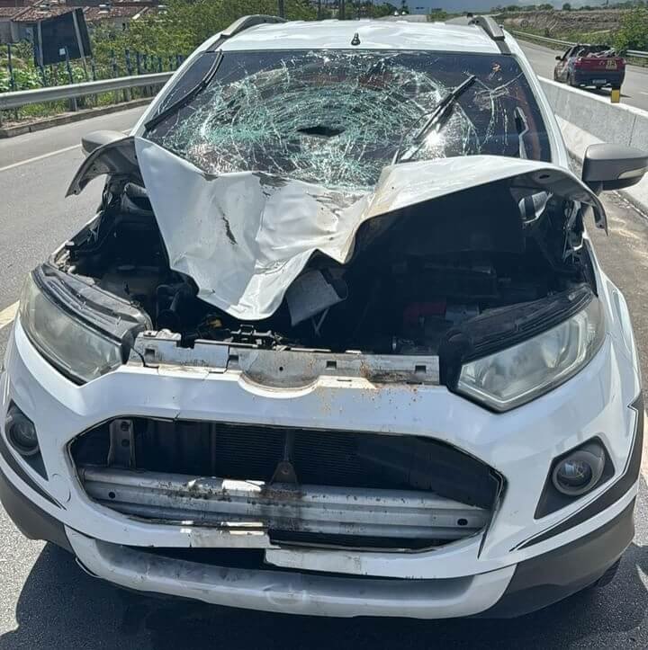 O carro envolvido no sinistro, uma Ford Ecosport, de cor branca, teve a parte da frente completamente destruída com o impacto.