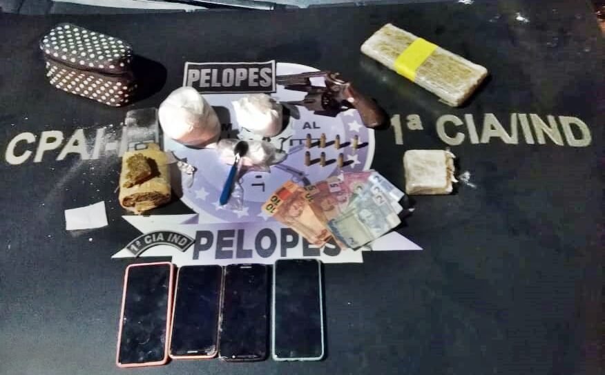 Com autorização do suspeito, a PM fez uma busca no imóvel, e encontrou um revólver Taurus, com sete munições, mais de 1kg de maconha (1.157), 541g de cocaína, além de uma balança de precisão e uma quantia em dinheiro.
