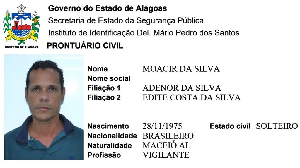 De acordo com a ficha civil, Moacir da Silva, nascido em 28 de novembro de 1975, é filho de Adenor da Silva e Edite Costa da Silva. Natural de Maceió, ele era solteiro, vigilante e residia no conjunto Mutirão, bairro do Centro em Rio Largo.