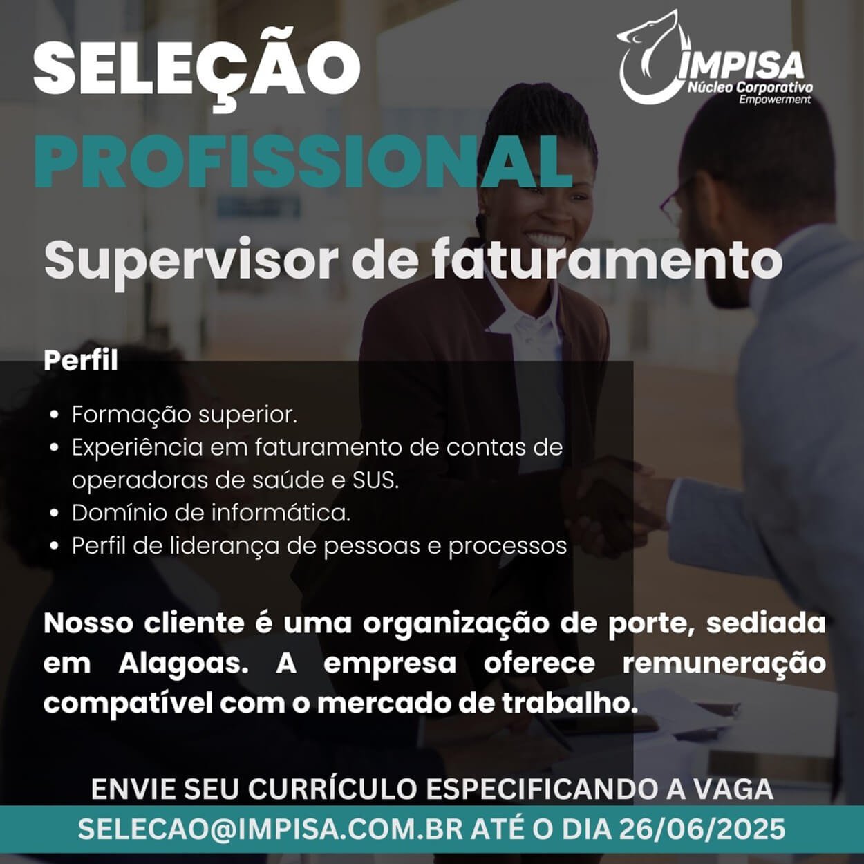 A empresa IMPISA – Núcleo Corporativo Empowerment está conduzindo um processo seletivo para uma vaga de Supervisor de Faturamento, destinada a atuação em uma organização de porte situada no estado de Alagoas.