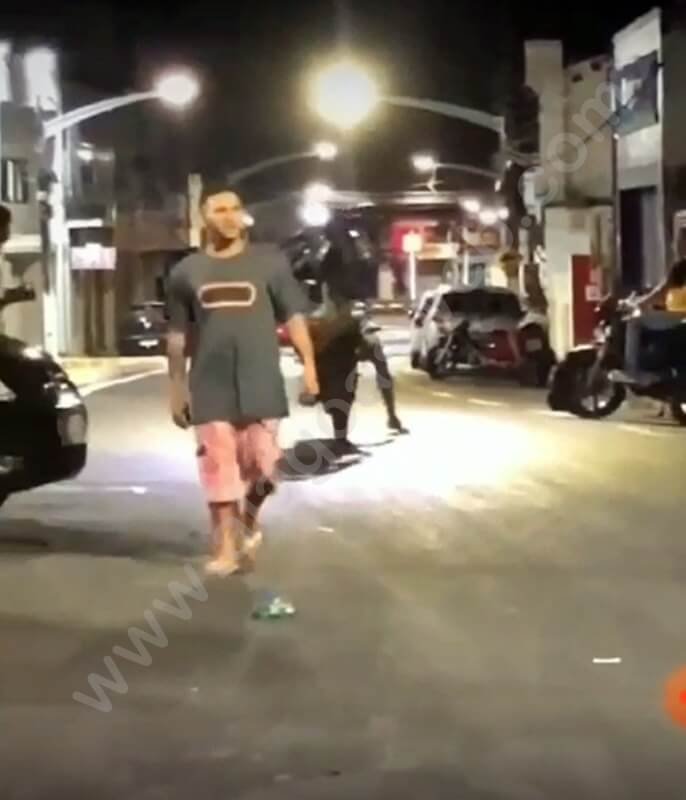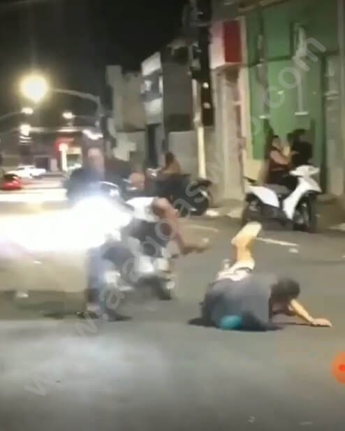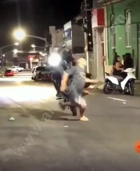 No vídeo é possível ver um motociclista empinando uma moto na contramão da rua, desde as imediações da Praça Miguel Cesar Teixeira (Praça do Relógio) até a Praça de Alimentação, onde ele acaba atropelando um pedestre.