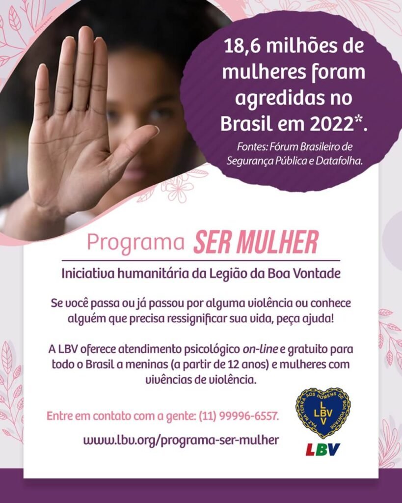 Por isso, a Legião da Boa Vontade (LBV) intensifica seu atendimento psicológico on-line, gratuito para pessoas do gênero feminino, a partir dos 12 anos, a ação faz parte do programa Ser Mulher que tem o objetivo de oportunizar apoio emocional, melhora da autoestima, autoconhecimento e empoderamento a meninas e mulheres, apoiando-as no enfrentamento e no rompimento dos ciclos de violência e na ressignificação das experiências vividas.
