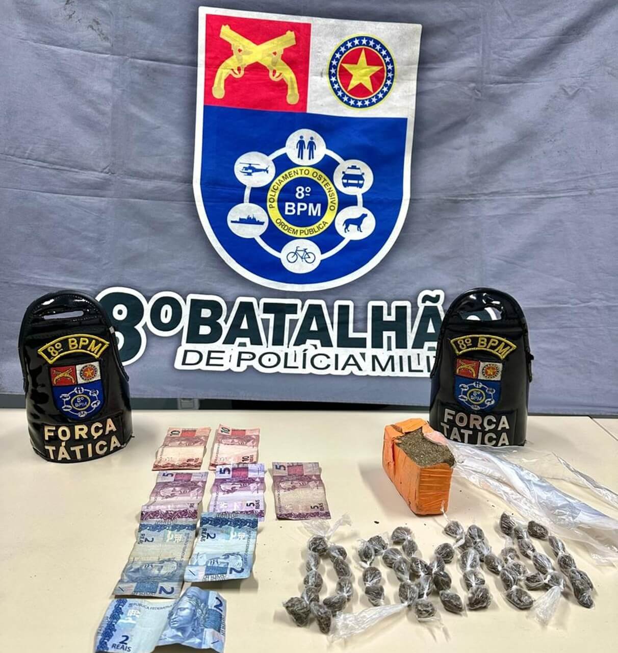 Durante a abordagem, os militares encontraram 260g de maconha, parte fracionada e embalada para venda, além de diversas embalagens plásticas utilizadas no tráfico. Também foi apreendida quantia em dinheiro.