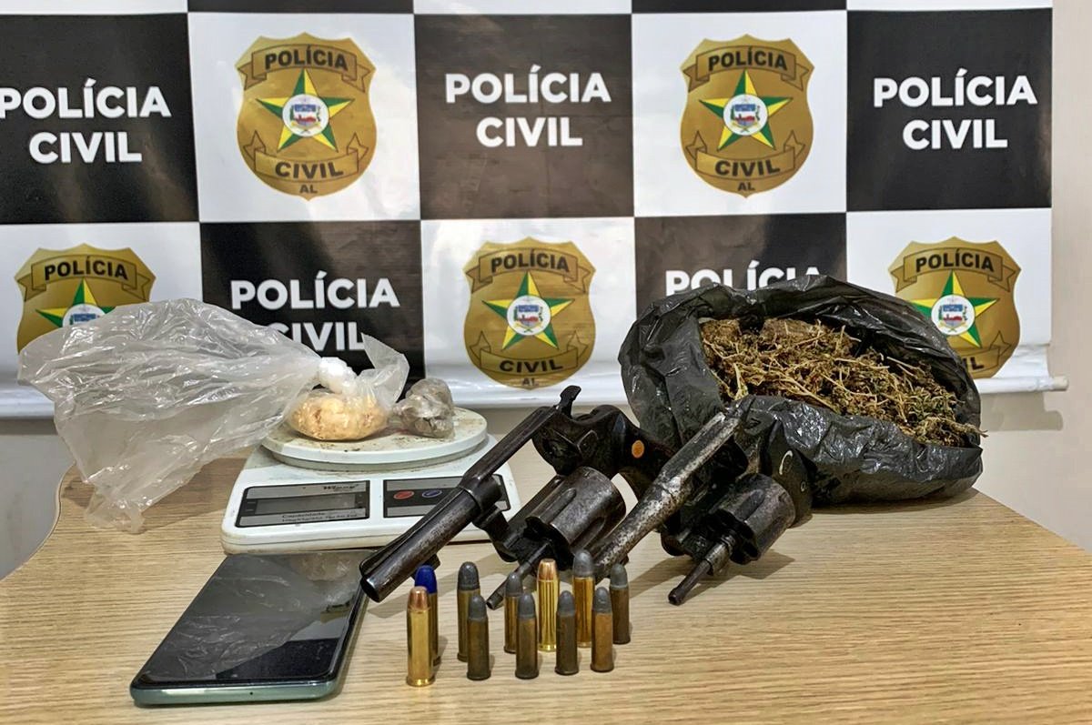 No imóvel do suspeito foram encontrados dois revólveres calibres 38 e 32, nove munições, um celular, 120g de maconha, 29g de crack e uma balança de precisão.