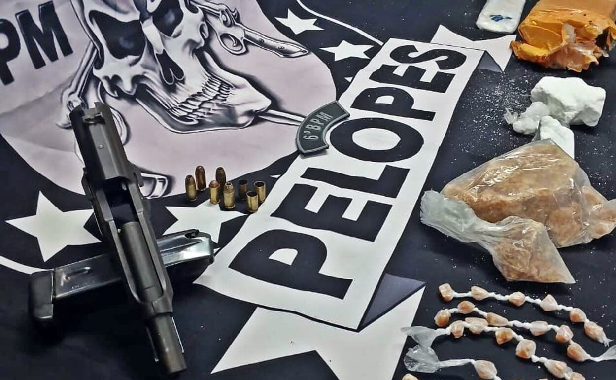 Com ele, foram apreendidas uma pistola calibre 380 com numeração suprimida, cinco munições intactas e três deflagradas do mesmo calibre, além de aproximadamente 668 gramas de maconha, 177 gramas de cocaína e 307 gramas de crack.