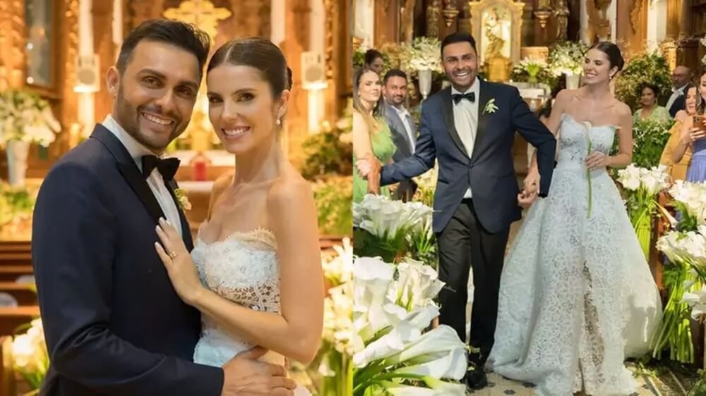 Os dois reuniram os amigos e familiares em uma cerimônia religiosa na Igreja Matriz de Nossa Senhora dos Homens, em Maceió. Para o seu grande dia, a noiva usou um vestido branco de renda no estilo sem alças da estilista Martha Medeiros. Por sua vez, o noivo apostou em um terno azul-marinho.