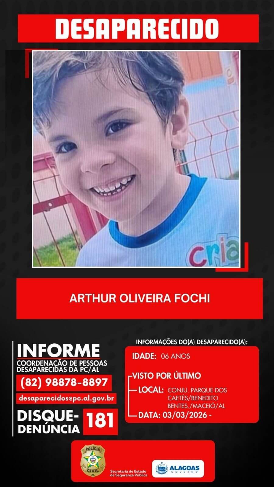 Uma busca intensa que mobilizou forças de segurança e a comunidade chegou a um desfecho trágico na manhã desta quarta-feira, dia 4 de março. O corpo de Arthur Oliveira Fochi, um menino de apenas 6 anos, autista não verbal, foi localizado sem vida em um lago situado no bairro Benedito Bentes, na parte alta da capital.