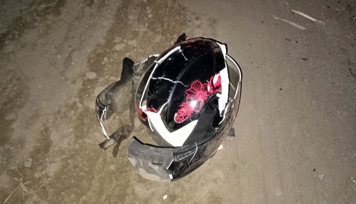 O choque projetou a motocicleta contra a lateral do veículo pesado e a vítima sofreu várias lesões e fraturas aparentes. O impacto destruiu o capacete do homem, provocando um ferimento grave em seu rosto.