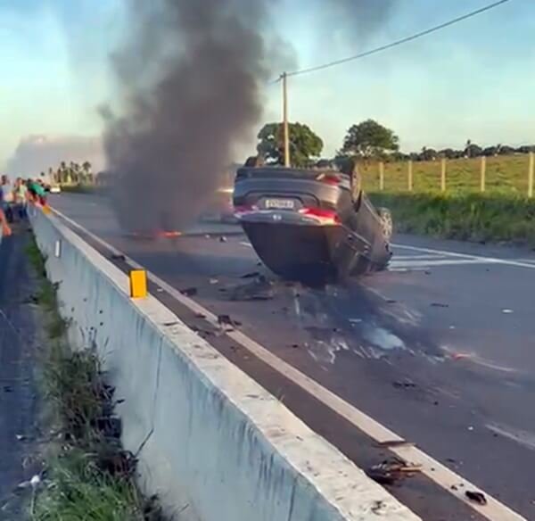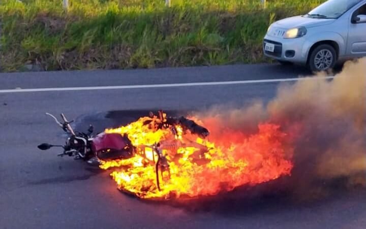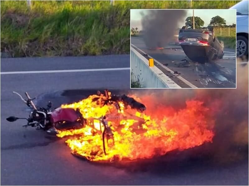 O choque entre uma motocicleta (de modelo não informado) e um Honda City, provocou a morte do condutor da moto, seguido do incêndio do veículo e o capotamento do carro de passeio.
